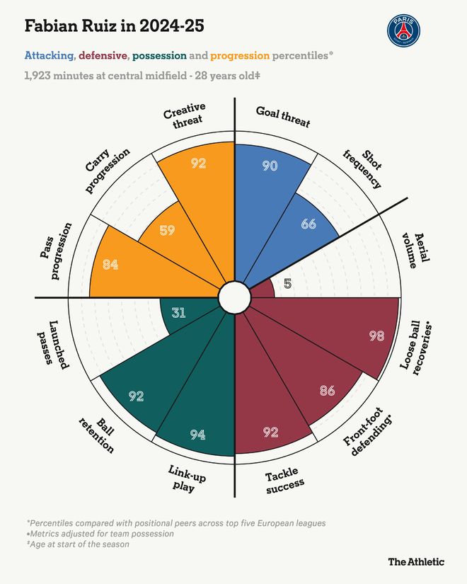 这份榜单上最低调的球员,法比安-鲁伊斯是另一位让巴黎圣日耳曼运转顺畅的中场球员。他不如维蒂尼亚那么引人注目,但同样高效。法比安在恩里克的球队中有球和无球状态下都表现出色。正如他的踢球风格图表所示,他很少丢球,利用自己魁梧的身材在巴黎圣日耳曼失去球权时迅速夺回,并提供创意火花。