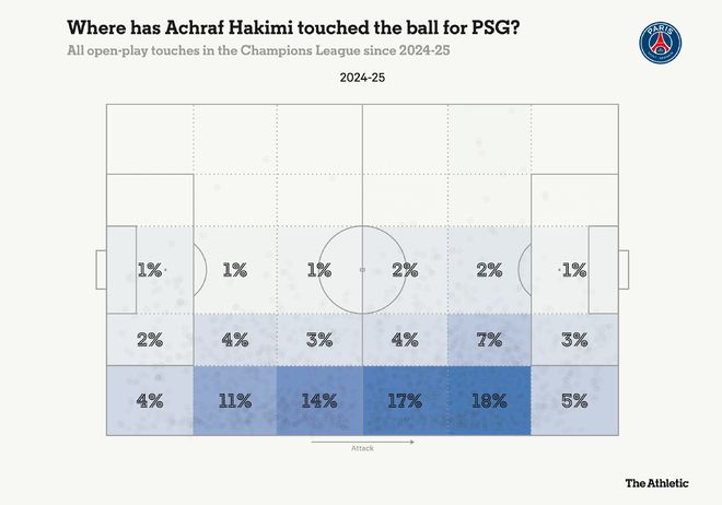 这部分是因为哈基米不懈的、极具侵略性的风格让他完全不像传统意义上的边后卫。上赛季,26岁的他在巴黎圣日耳曼的大部分触球都在对方半场,并在四分之一决赛、半决赛和决赛中均有进球。