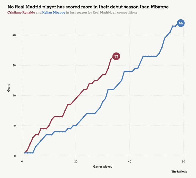 姆巴佩上赛季的辉煌更多体现在个人层面而非集体层面,皇家马德里的奖杯仅限于欧洲超级杯和洲际杯,按他们的标准来看这是一个相对平淡的赛季。关于他的天赋是否足以弥补他在无球状态下有限的投入仍有疑问,但这位26岁球员上赛季的原始进球数据无疑令人瞩目。