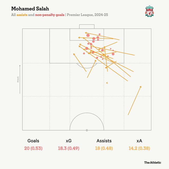 即使以萨拉赫的高标准来看,2024-25赛季也显得格外突出。这位埃及球员在英超贡献了47个进球,比欧洲五大联赛中的任何球员都要多。他输出的稳定性令人惊叹:过去四个赛季中,他是唯一一个在这些联赛中每赛季进球和助攻均达到两位数的球员。