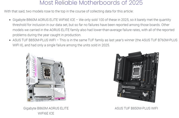至于主板,由于结构复杂,其平均故障率通常在5%到6%之间,但在本次报告中,技嘉B860M Aorus Elite WiFi 6E Ice和华硕Tuf B850M-Plus WiFi表现优异,前者实现零故障,华硕全年仅一例故障。