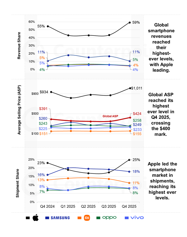 2025年第四季度全球智能手机市场营收同比增长13%至1430亿美元,创下历史新高。在这场价值增长的盛宴中,苹果一家就拿走了59%的营收份额。