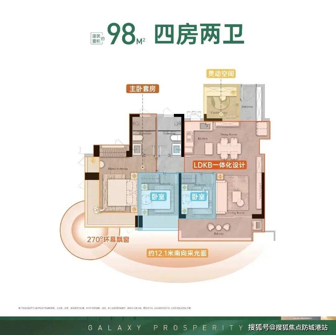 98㎡四房两厅两卫,是项目的热门户型,凭借合理的布局、超高的空间利用率,成为三口之家升级的首选,既能满足家庭人口增加的需求,又能保证居住的舒适度,兼顾实用性和舒适性。