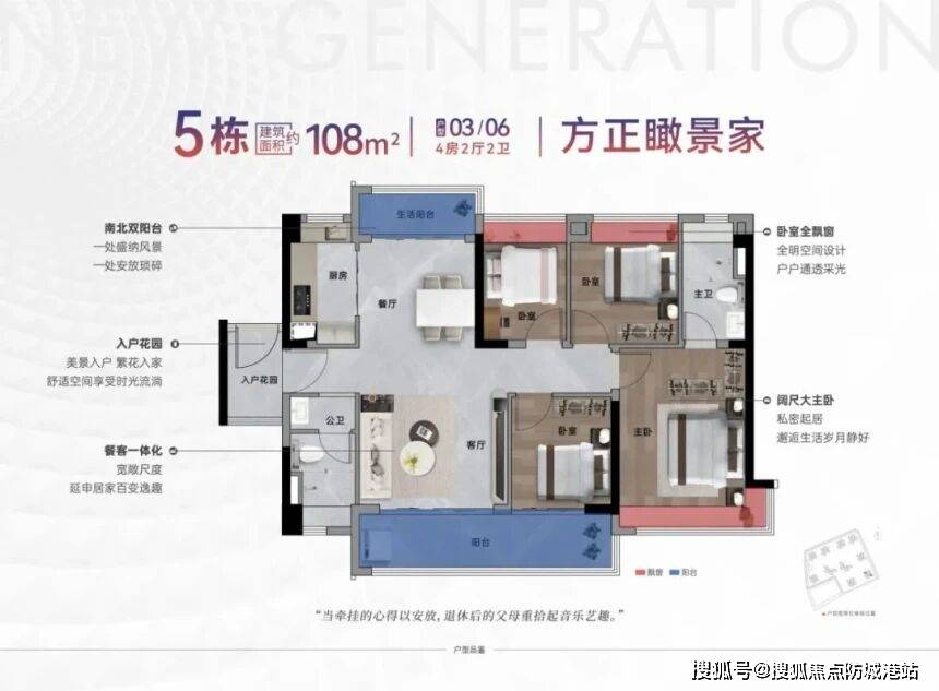 然后是刚改家庭的“优选户型”——108平方米四房五开间朝南,这个户型主打“舒适+实用”,适配三孩家庭或者有老人一起居住的家庭。五开间朝南的设计,在同价位户型中非常少见,客厅、三个卧室、一个书房都朝南,采光和通风效果堪称“顶级”,每个房间都能晒到太阳,家里不会潮湿阴暗,居住舒适度极高。客厅连接阔景阳台,阳台宽敞明亮,既能晾晒衣物,也能打造为休闲区,摆放桌椅、种植花草,周末和家人一起喝茶、聊天,享受惬意时光。四个房间的布局合理,主卧套房设计,自带独立卫生间和衣帽间,提升居住私密性和舒适度;另外三个房间大小适中,可作为儿童房、老人房、书房,满足不同家庭的居住需求。厨房采用U型设计,操作空间宽敞,做饭更加便捷;两个卫生间都采用干湿分离设计,干净卫生,适配多人口家庭的居住需求。