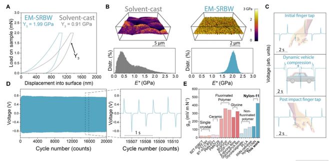 图5:机械性能、长期耐久性及极端负载性能。 (A)溶剂浇铸对照和EM-SRBW尼龙-11薄膜的压缩模量(Y3)及(B)有效弹性模量(E)映射图(上部)以及代表数据分布的直方图(下部);弹性模量叠加在原子力显微镜获得的形貌图上。(C)车辆碾压前(上部)和后(下部)通过手指敲击测量的压电输出,显示功能保留。(D)在ΔF = 48 N的接触力下,20,000次加载循环中压电响应的稳定性。(E)EM-SRBW薄膜的压电电压系数g33与其它压电聚合物的对比。
