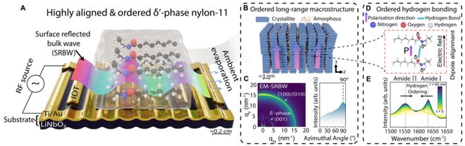 图1:SRBW合成与表征示意图。 (A)用于合成高度取向δ′相尼龙-11薄膜的SRBW装置示意图。(B)通过SRBW的机电耦合实现材料晶体结构长程有序(导致3方向净偶极极化)的示意图。(C)通过原位同步辐射掠入射广角X射线散射图样(左图,入射角0.12°)确认了上述有序结构;右图展示了方位角分析,用于表征散射图案中德拜-谢勒环的各向异性。(D)薄膜中排列的偶极及分子有序氢键网络示意图。(E)原位同步辐射高分辨率红外光谱中,EM-SRBW尼龙-11的酰胺I和酰胺II带分别向较低和较高波数移动,验证了氢键网络的有序性。