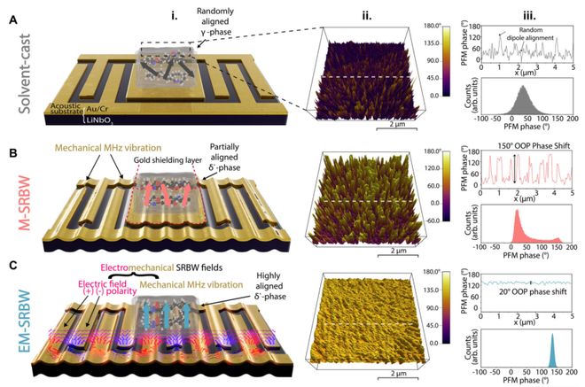 在偶极取向方面(图3),压电力显微镜分析表明,溶剂浇铸薄膜的偶极随机分布;M-SRBW薄膜在纯机械振动下结晶,偶极出现部分排列;而EM-SRBW薄膜则表现出高度一致的偶极排列,相位信号集中,证实了电声耦合中的电场分量对实现整体薄膜偶极对齐起着主导作用。
