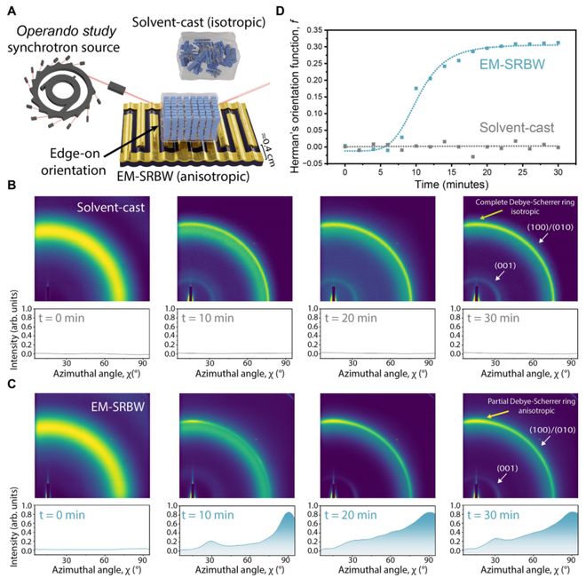 图2:长程晶体有序性。 (A)表示溶剂浇铸对照样品各向同性与EM-SRBW尼龙-11宏观结构各向异性的同步辐射原位GIWAXS实验示意图。(B)和(C)的二维GIWAXS图案分别显示了溶剂浇铸对照中的随机有序和EM-SRBW薄膜中的长程晶体有序,这通过完整和部分的德拜-谢勒环来证明。(D)通过赫曼取向函数对溶剂浇铸对照和EM-SRBW薄膜的长程晶体有序随时间变化进行定量评估。