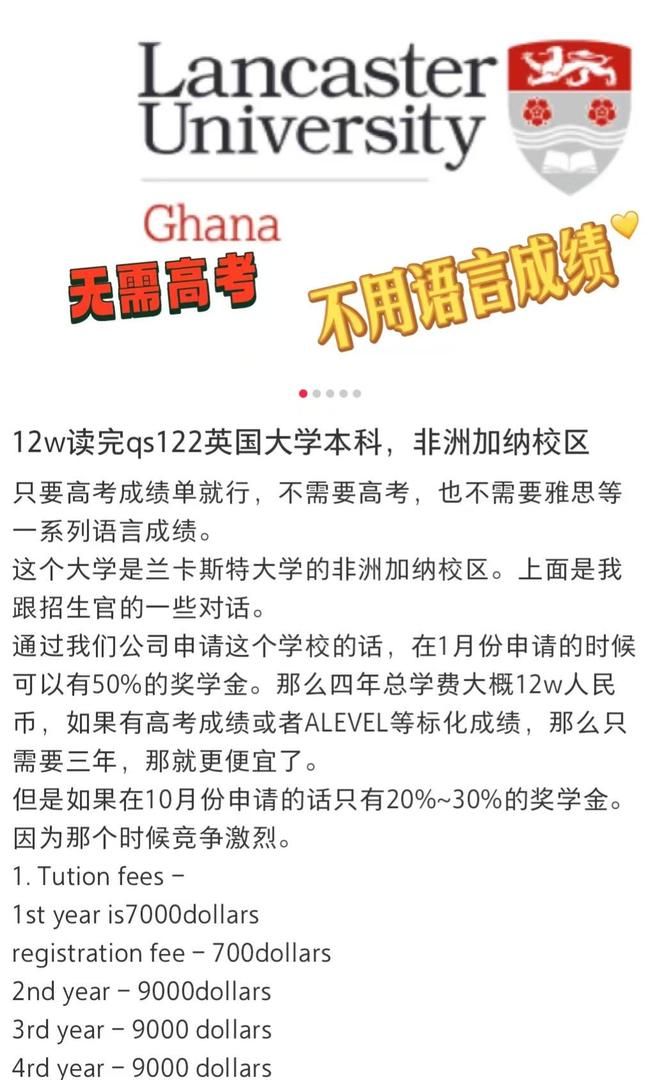 以英国兰卡斯特大学非洲加纳校区为例,该校四年制本科总学费约为12万元人民币——这个数字甚至不够支付英国本校一年的学费。