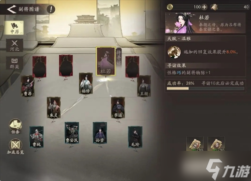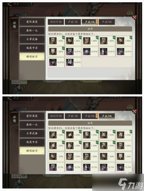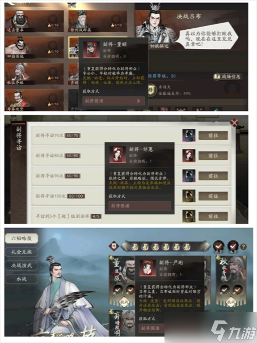 1.副将与图谱数值加成:副将在游戏里就像带有特殊词条的装备,获取方式除了主将池和麒麟献宝,还有见真章的某些关卡和六韬略计中的龙赏,副将图谱中的寻访和寻访任务等。
