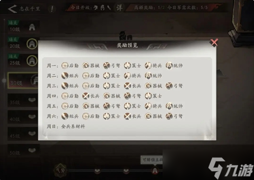 而且大地图有许多支线任务可以触发,如果不想一个个找,可以在府内找程昱,他可以给你提供各种支线.兵营培养:这个资源获取在志在千里。每天提供的资源种类都不同。在体力不紧张的情况下,推荐把每天的两次高额奖励次数都使用。其实兵营培养的数值加成不是特别高,主要是为了大招加成和三级练兵营后的兵种特殊加成。