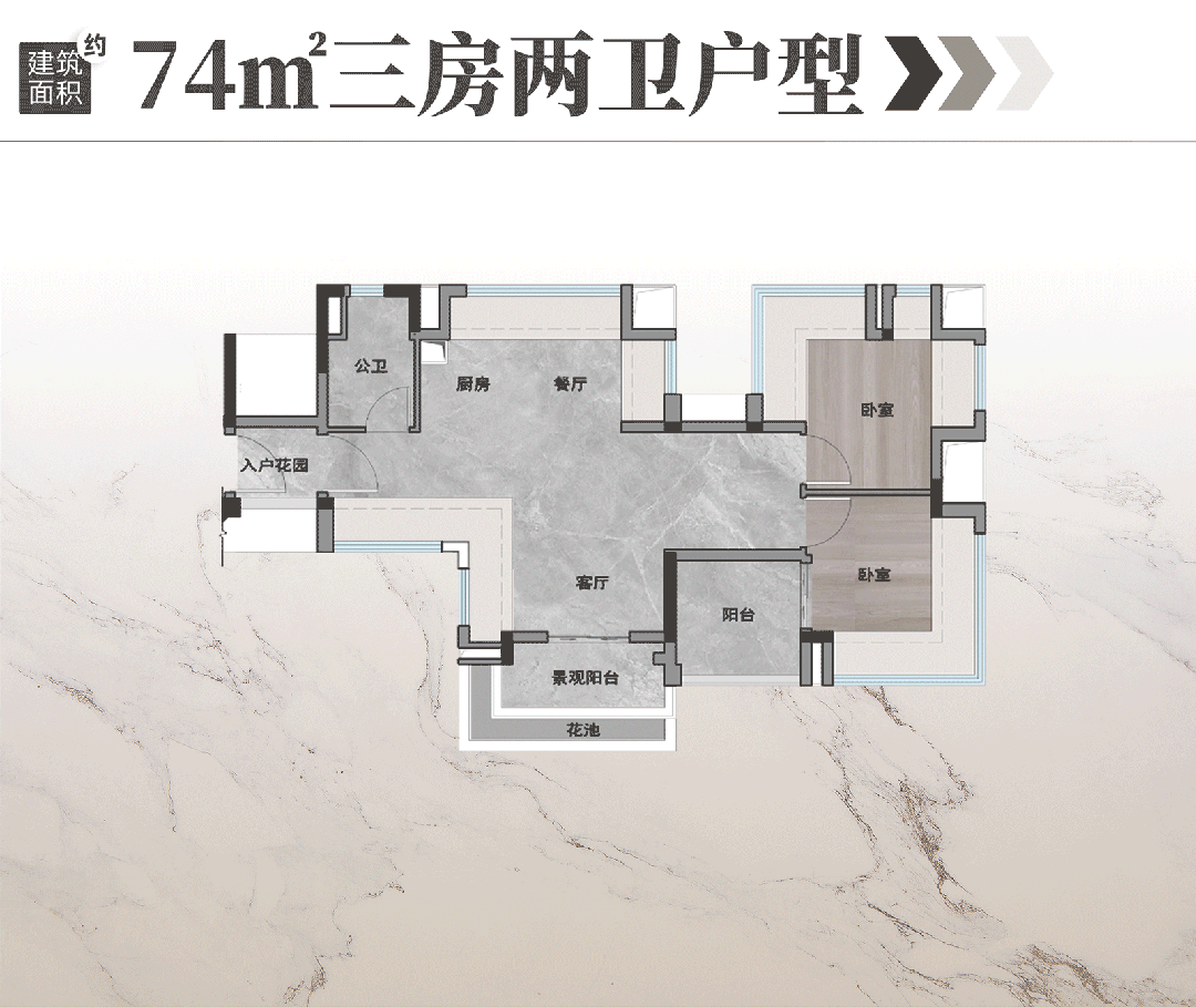 并且户型最高能到110%的使用率,完全不输同期的产品。约74㎡三房不仅朝南,更是拥有
